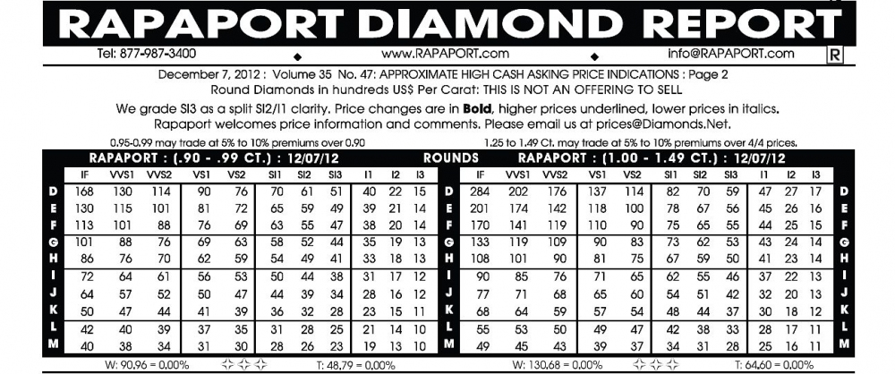 Цены прайс-листа Рапапорта являются отправной точкой на пути к окончательному соглашению в сделке при покупке бриллиантов, как для частных покупателей, так и для бриллиантовых дилеров с ежегодным оборотом в сотни карат.